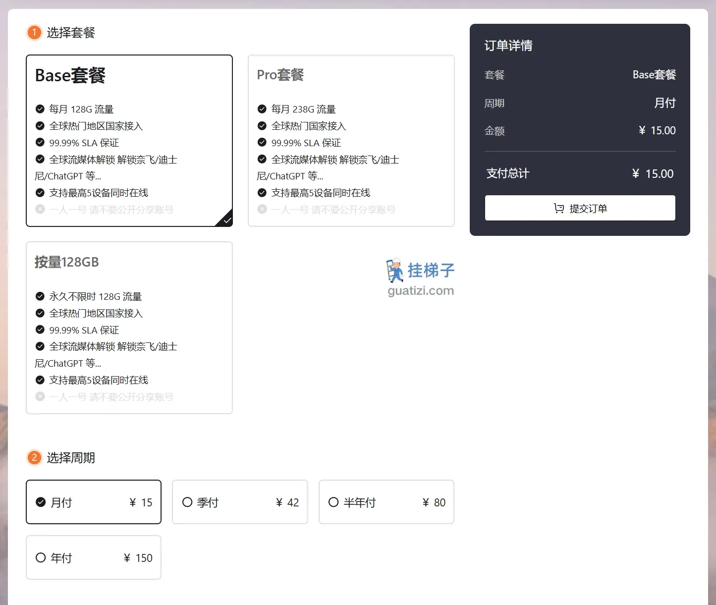 比较简单的套餐设置,两个月付套餐,加一个不限时长的按量付费流量包。Pro 套餐月付 ¥26 元,不限时长流量包售价 ¥118 元。