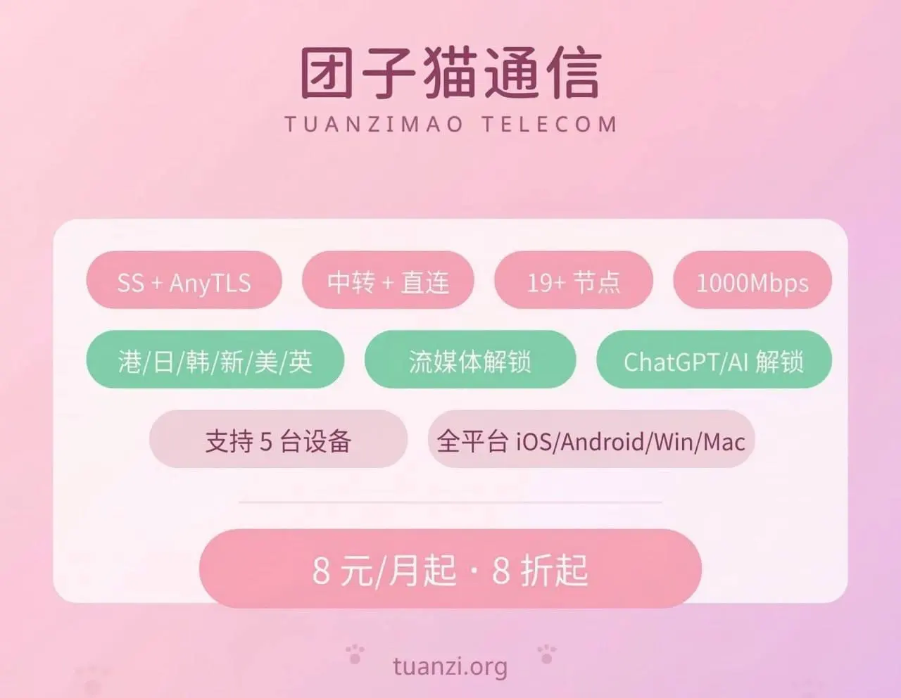团子猫通信 Tuanzimao Telecom,一家 2026 年新开业的小众机场,定制客户端支持 Windows、macOS、Android 和 Linux。